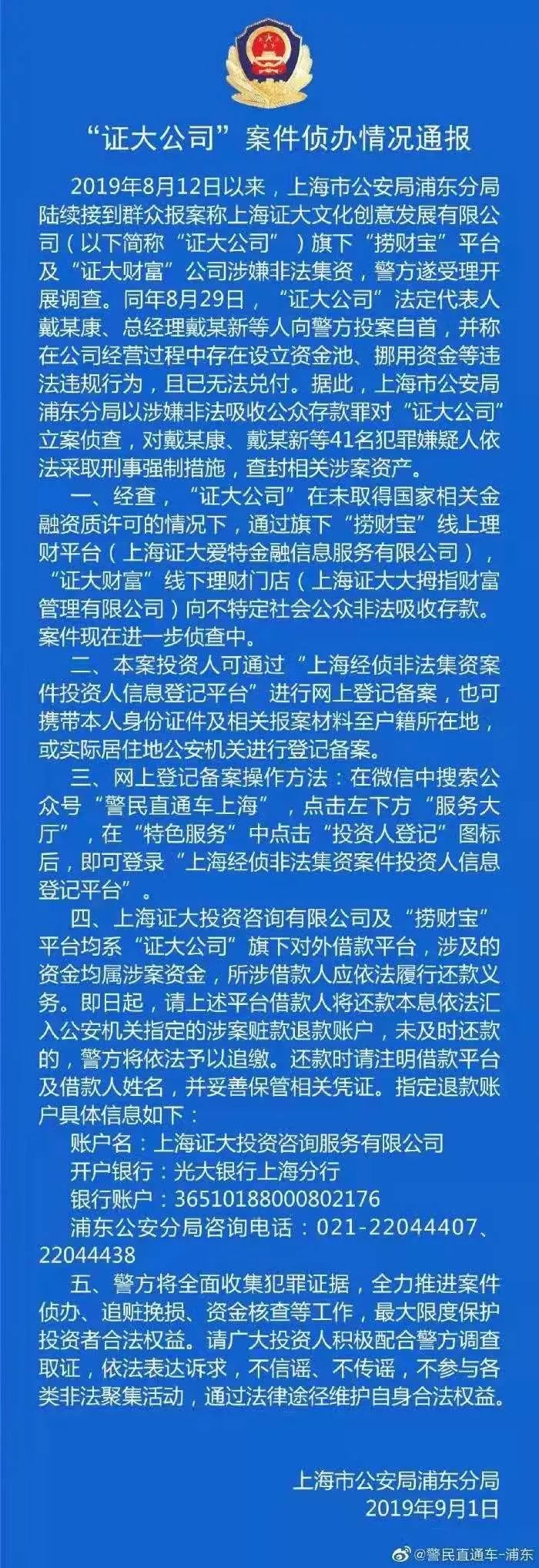 8月29日,证大公司法定代表人戴某康、总经理戴某新等人向警方投案自首,并称在公司经营过程中存在设立资金池、挪用资金等违法违规行为,且已无法兑付。
