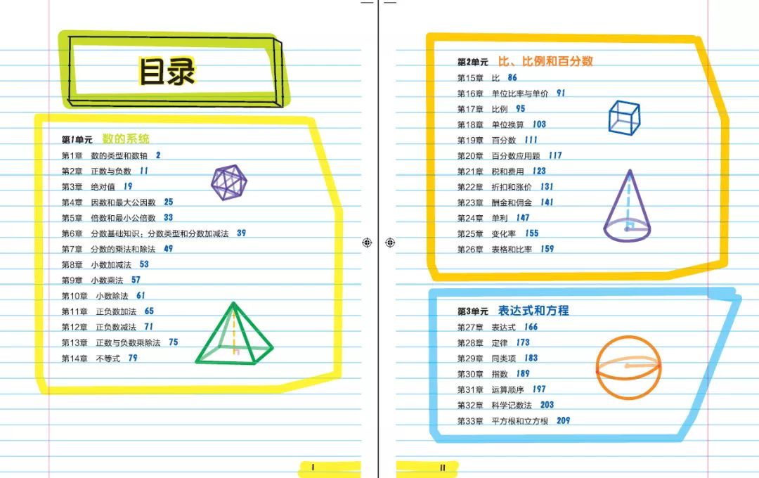 基本涵盖了小学到初中的所有数学知识,前面三个单元(数的系统,比、比例和百分数,表达式和公式)是小学的数学知识,后面三个单元(几何、统计和概率、平面直角坐标系与函数)是初中的数学知识。