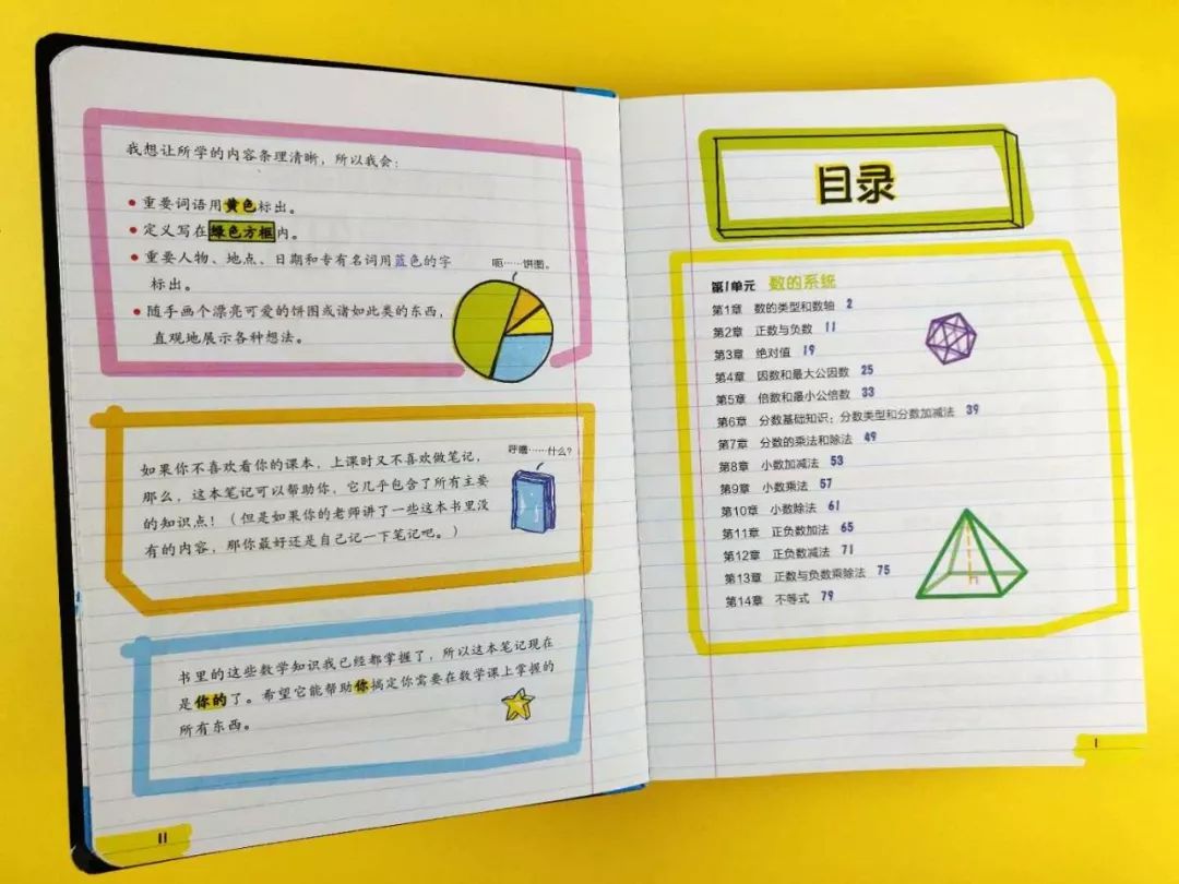 以数学学科为例。这是“美国少年学霸超级笔记”的目录:将数学知识分门别类装进了数、式、几何、统计、函数等数学模块之中,条理清晰、一目了然。