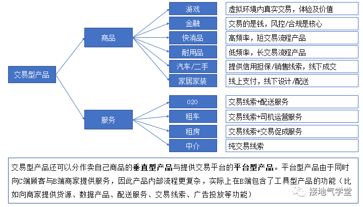 以交易的东西不同,还能细分为商品/服务两大类。由于特定的商品,其生产方式、交付方式有特点,因此还能根据商品特点,进一步细分出,诸如游戏、金融、消费品、耐用品等诸多各具特色的细类。