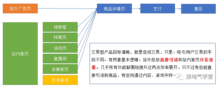 交易型产品,以促成交易为核心目标。因此关注GMV(Gross Merchandise Volume 商品交易总额),关注从推广到成交的全交易流程的转化率。