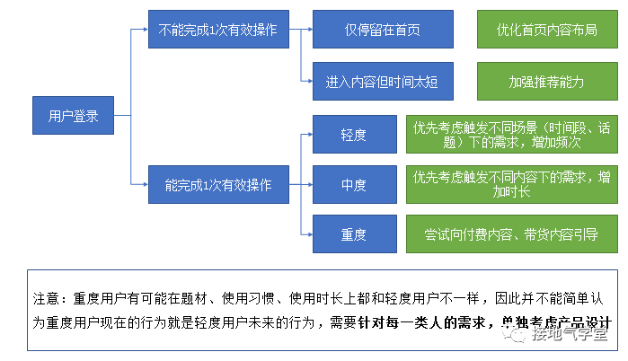 但注意,内容型产品中,用户的一次浏览行为常常是短暂且分散的,用户每次登录后是一组行为的组合(先看看这个,再看看那个)。因此需要做用户分群,根据时长/频次,区分出轻中重用户,再看不同产品功能,如何满足不同类型用户: