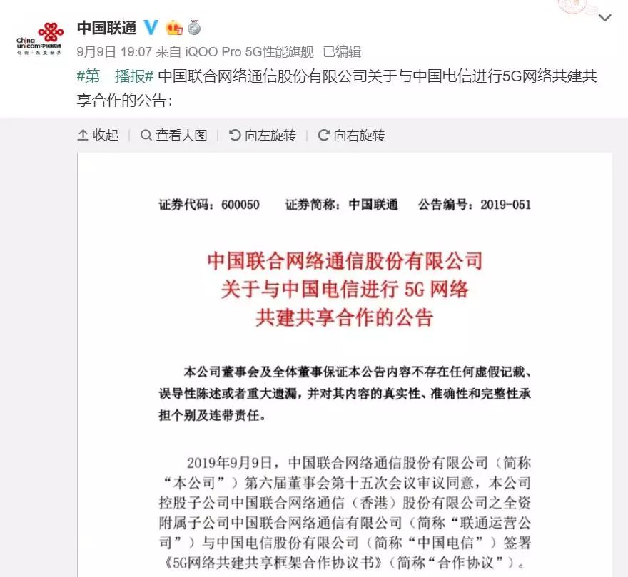 根据联通在 9 月 9 日发布的公告,联通和电信将在全国范围内合作共建一张 5G 接入网络。根据协议划分各自负责区域,以“谁建设、谁投资、谁维护、谁承担网络运营成本”的前提来共同使用双方建设的 5G 网络。
