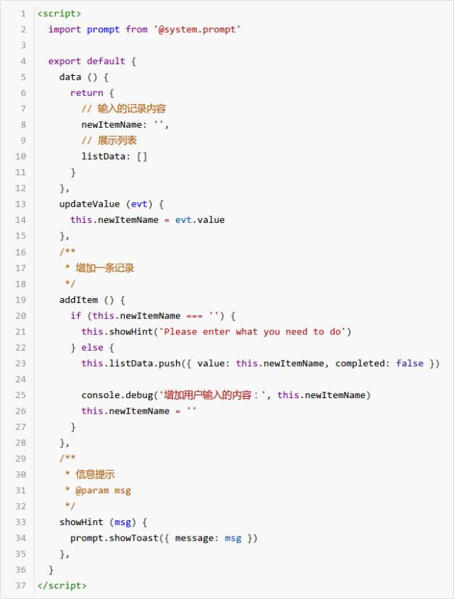 1) ViewModel 的 data 中定义 newItemName 属性用于记录用户输入的内容