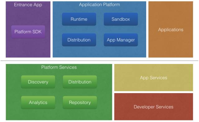 2 . 横线下方是服务器,包括上文提到的诸如推送、帐号、支付等常见的应用服务,以及开发者后台服务,另外就是平台自身的各种服务,比如分发、统计、应用仓库等服务