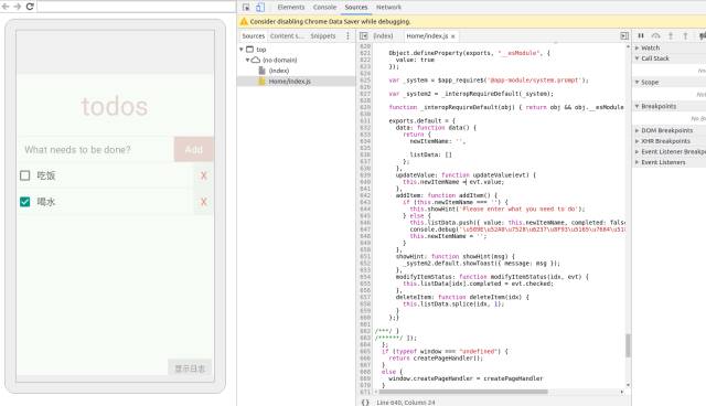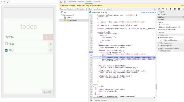 如上图所示,在 addItem() 内打断点,当手机完成点击 Add 按钮时会将 JS 线程停止到断点处,然后就可以做单步调试了。