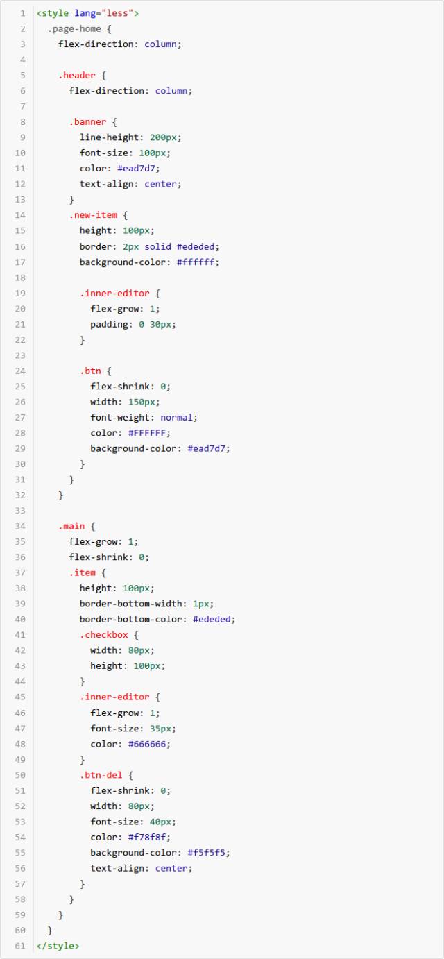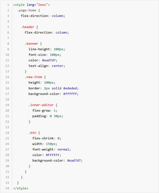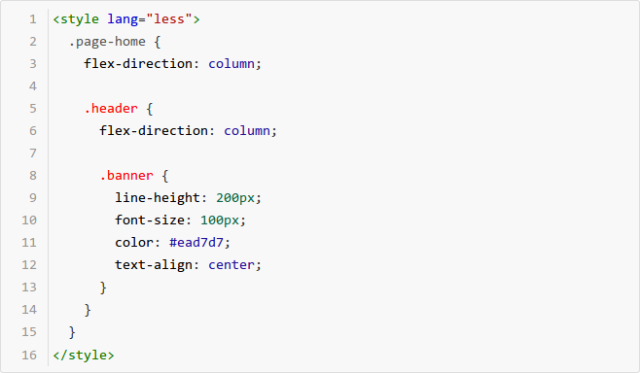 2) style:即 CSS 样式表,用于配置页面样式,为了方便 CSS 预处理,我们也支持 less 预编译能力,在 style 节点上增加属性 lang="less"的声明即可