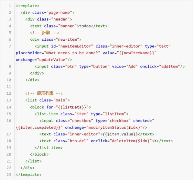 7) 增加 text 组件,展示 X 删除待办事项的功能,绑定 click 事件到方法 deleteItem($idx)