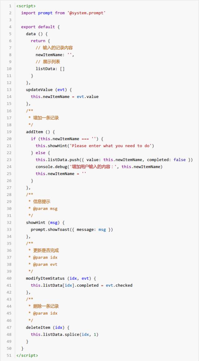 2) 新增方法 deleteItem():点击列表中每行结束时的 X 标识,用于删除该条记录