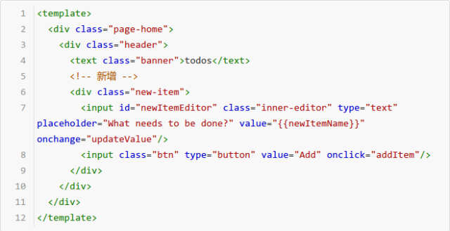 我们在 VM 上添加 input 更新内容的事件绑定 updateValue(),和按钮响应增加记录的事件绑定 addItem():