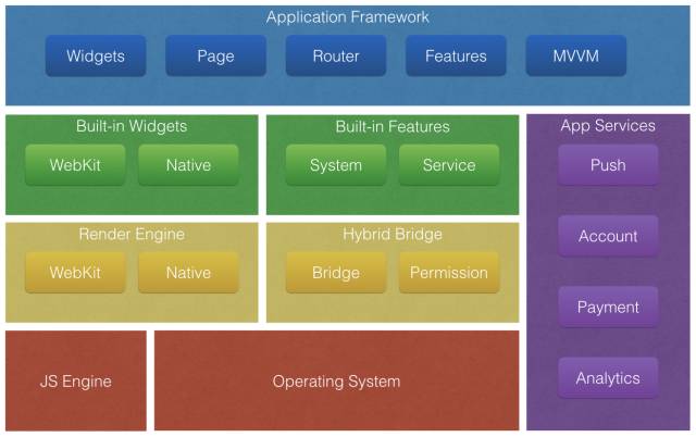 2 . 中间黄色部分,我们提供了一套桥接能力,将系统的接口能力暴露到前端,在此基础之上,我们暴露了大量的系统能力,比如文件存储、二维码扫描、设备信息等等,另外还集成了很多常见服务,比如推送、帐号、支付等等,在右侧紫色部分表示