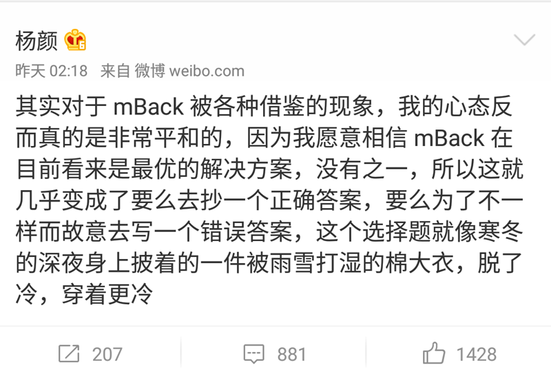 而这一优秀设计自然是会遭到同行的借鉴,当时魅族工程师是表示并不在乎厂商来借鉴这一设计的,但魅友却咽不下这口气,其中不少魅友还跑去抵制其他拥有相似设计的安卓产品。后续则是演变成了“mBack是否被抄袭”这么一个地步,虽然从当时的回答来看魅族的这一外观设计确实算不上是第一个,但它的mBack按键确实有着其他手机厂商都无可比拟的便捷性。我相信当时的其他厂商并不是做不到,而是他们压根没想到可以这么做,在这一点上我个人还是比较佩服魅族的。