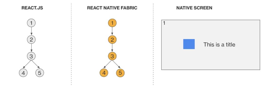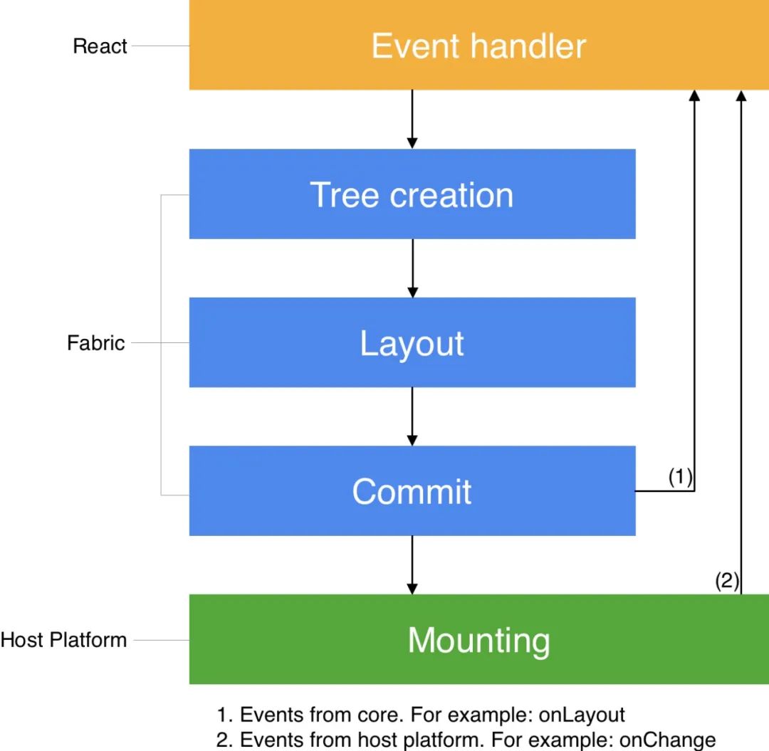 React 元素树和元素树中的元素并不是一直存在的,它只一个当前视图的描述,而最终是由 React “fiber” 来实现的。每一个 “fiber” 都代表一个宿主组件,存着一个 C++ 指针,指向 React 影子节点。这些都是因为有了 JSI 才有可能实现的。学习更多关于 “fibers” 的资料参考 这篇文档。