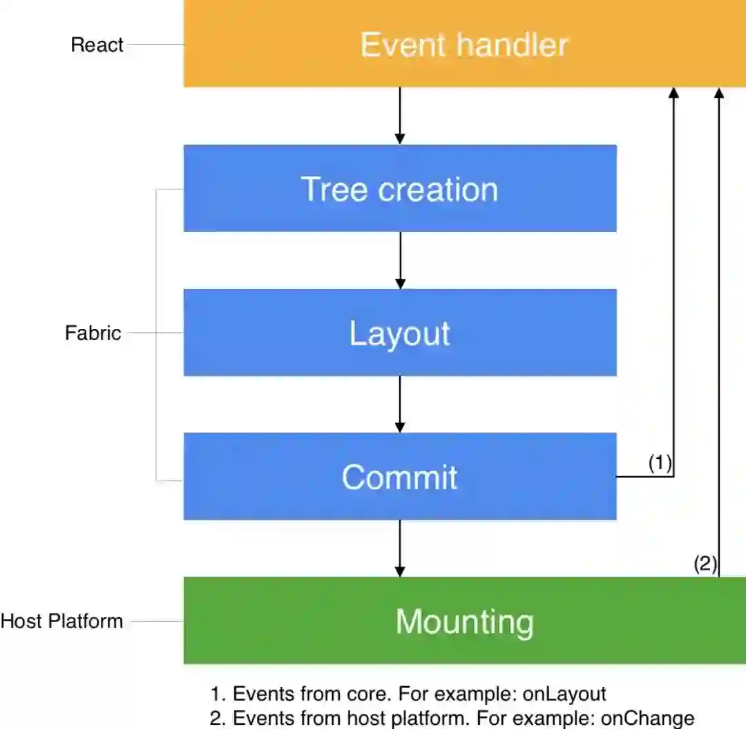 Fabric 是 React Native 新架构的渲染系统,是从老架构的渲染系统演变而来的。核心原理是在 C++ 层统一更多的渲染逻辑,提升与宿主平台(host platforms)互操作性,并为 React Native 解锁更多能力。研发始于 2018 年和 2021 年,Facebook 应用中的 React Native 用的就是新的渲染器。