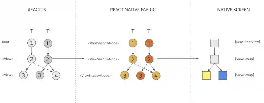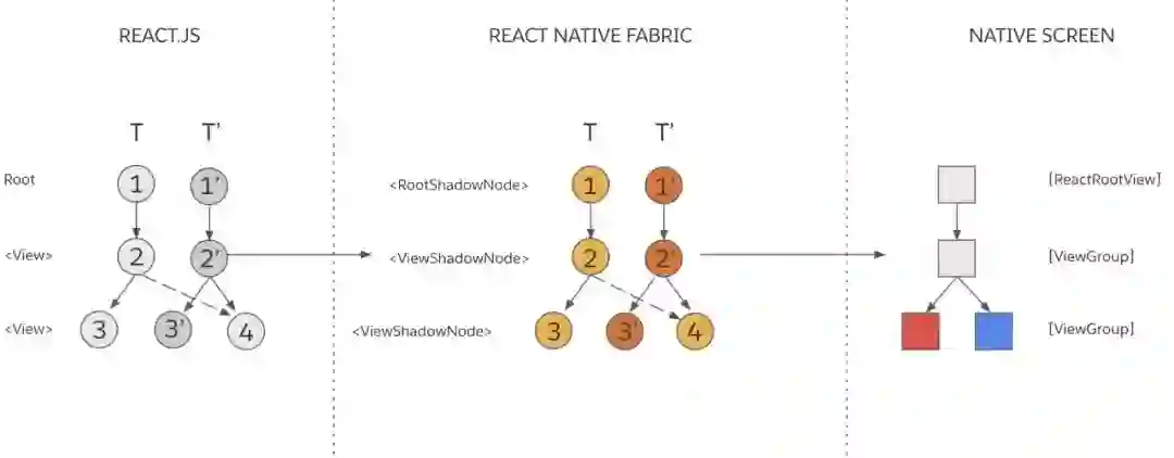 树对比(Tree Diffing): 这个步骤会计算“先前渲染的树”(T)和“下一棵树”(T')的区别。计算的结果是原生视图的变更操作。