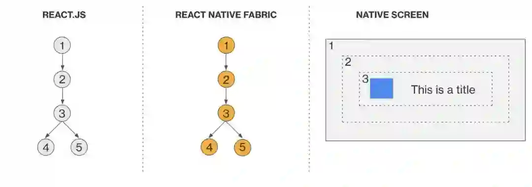 React 影子树(React Shadow Tree):React 影子树是通过 Fabric 渲染器创建的,树由一系列 React 影子节点组成。一个 React 影子节点是一个对象,代表一个已经挂载的 React 宿主组件,其包含的属性 props 来自 JavaScript。它也包括布局信息,比如坐标系 x、y,宽高 width、height。在新渲染器 Fabric 中,React 影子节点对象只存在于 C++ 中。而在老架构中,它存在于手机运行时的堆栈中,比如 Android 的 JVM。