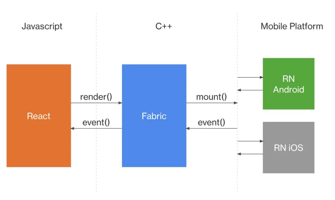 Fabric 渲染器(Fabric Renderer):React Native 执行的 React 框架代码,和 React 在 Web 中执行代码是同一份。但是,React Native 渲染的是通用平台视图(宿主视图)而不是 DOM 节点(可以认为 DOM 是 Web 的宿主视图)。Fabric 渲染器使得渲染宿主视图变得可行。Fabric 让 React 与各个平台直接通信并管理其宿主视图实例。Fabric 渲染器存在于 JavaScript 中,并且它调用的是由 C++ 代码暴露的接口。在这篇文章中有更多关于 React 渲染器的信息。