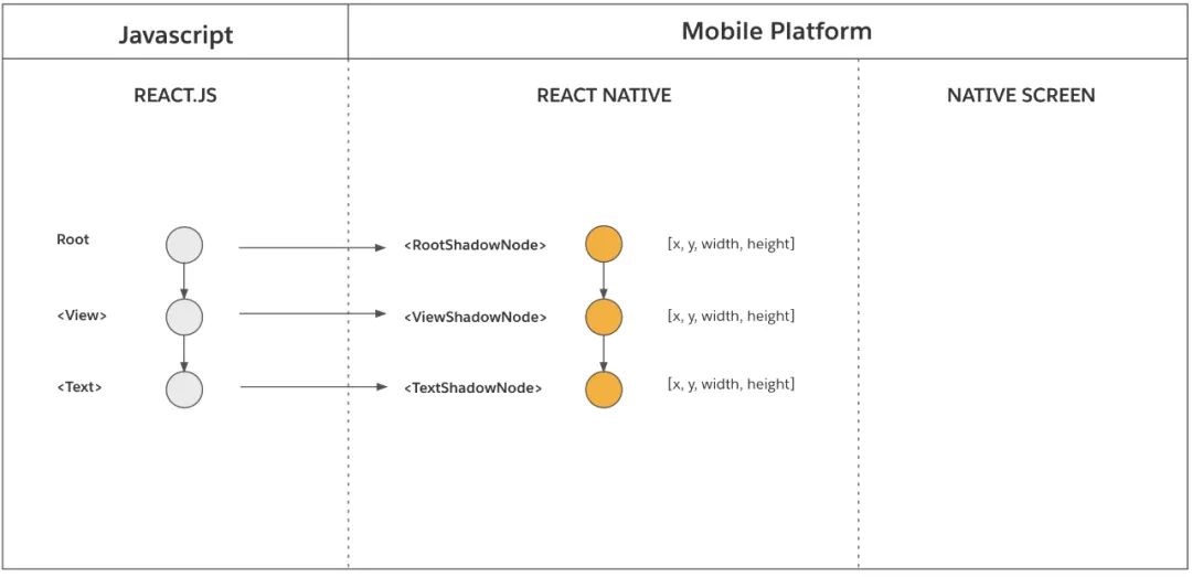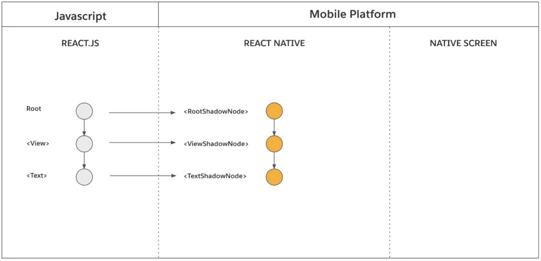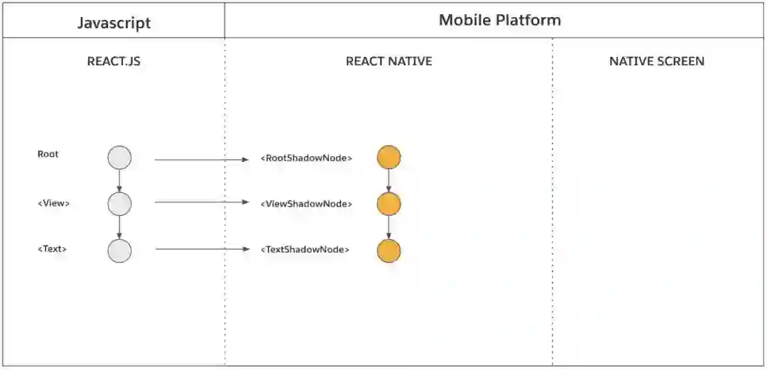 在元素简化的过程中,每调用一个 React 元素,渲染器同时会同步地创建 React 影子节点。这个过程只发生在 React 宿主组件上,不会发生在 React 复合组件上。比如,一个 <View>会创建一个 ViewShadowNode 对象,一个<Text>会创建一个TextShadowNode对象。注意,<MyComponent>并没有直接对应的 React 影子节点。