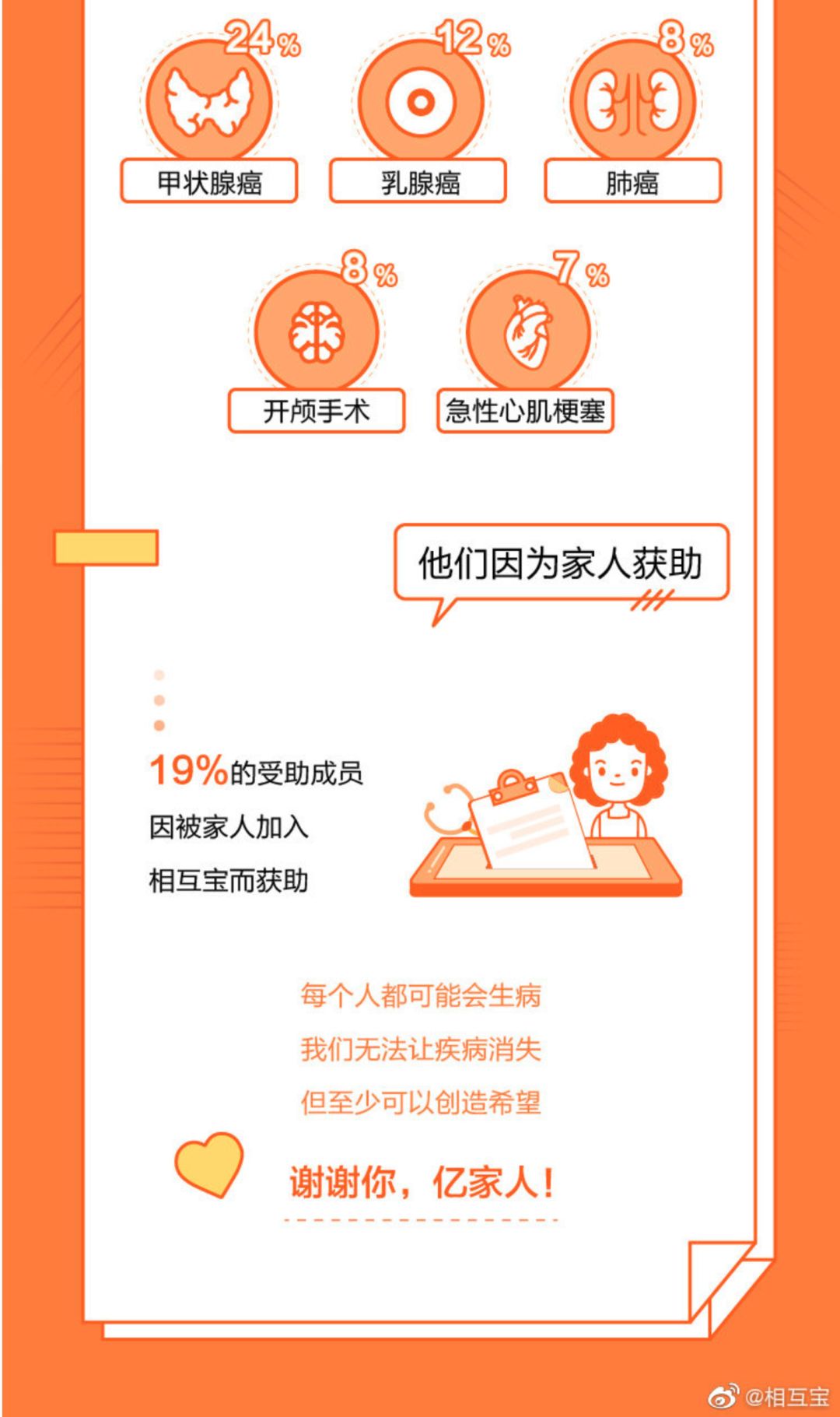 11 月 27 日,支付宝旗下的大病互助计划「相互宝」宣布,截至 11 月 27 日,全国已有超 1 亿人加入相互宝,成为全球最大的互助社区。根据相互宝的公开数据,相互宝的 1 亿成员有三分之一来自农村和县域,近 6 成成员来自三线及以下城市。数据同时显示,这 1 亿人在获得保障的同时,累计救助了 1.19 万名身患重病的成员,其中近一半是 80 后和 90 后。