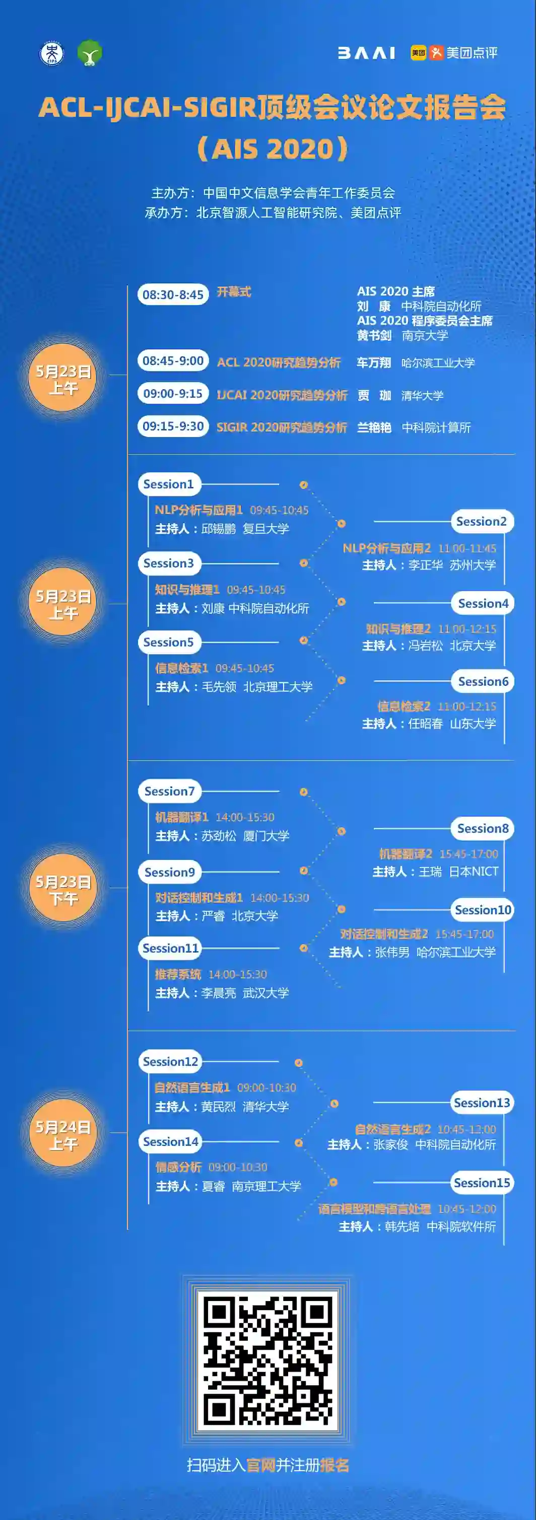 AIS 2020 由北京智源人工智能研究院、美团点评承办,共征集三大会议论文共 74 篇,分为 15 个 session,包含自然语言分析和应用、知识和推理、信息检索、推荐系统、机器翻译、情感分析、对话控制和生成、自然语言生成、语言模型和跨语言处理等热点研究问题和方向。