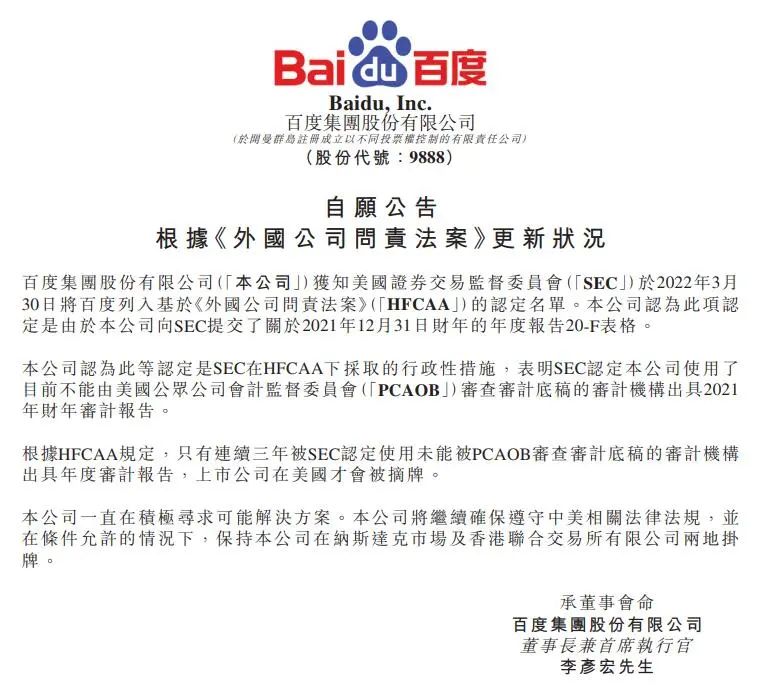 当地时间周三,美国证券交易委员会(SEC)将百度、富途控股、爱奇艺、凯信远达医药和从事渔业养殖的Nocera加入“预摘牌名单”。这5家公司需要于4月20日前向SEC提供证据,证明自己不具备被摘牌的条件。3月31日,百度发布公告,称一直在积极寻求可能解决方案,在条件允许的情况下,保持在纳斯达克市场及香港联合交易所有限公司两地挂牌。爱奇艺声明称,将积极谋求解决方案,保护股东利益。(每日经济新闻)