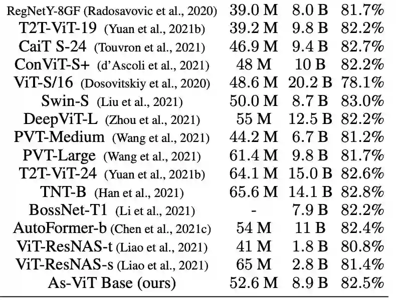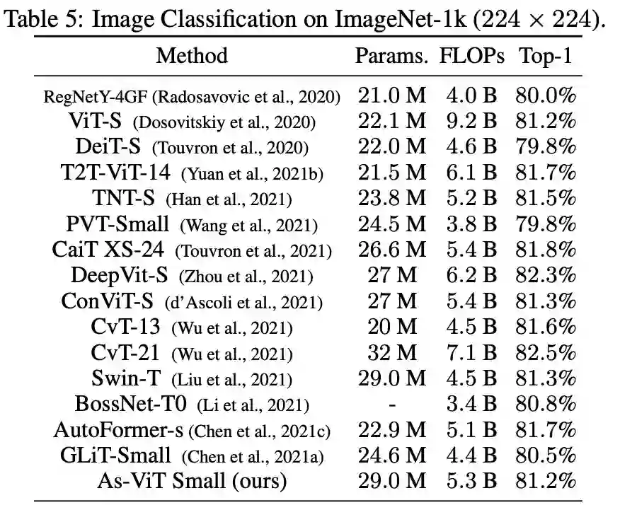 下表 5 展示了 As-ViT 与其他模型的比较。与之前基于 Transformer 和基于 CNN 的架构相比,As-ViT 以相当数量的参数和 FLOP 实现了 SOTA 性能。