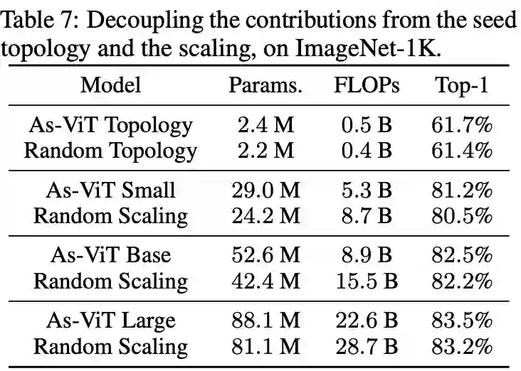 第二,该研究将基于复杂度的规则与「随机扩展 + As-ViT 拓扑」进行比较。在不同的扩展下,该研究的自动扩展也优于随机扩展。