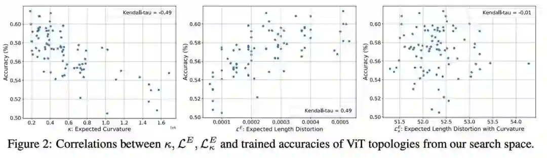 ViT 训练速度很慢,因此,通过评估训练模型的准确率来进行架构搜索的成本将高得让人难以承受。最近学界出现很多用基于 ReLU 的 CNN 的免训练神经架构搜索方法,利用局部线性图 (Mellor et al., 2020)、梯度敏感性 (Abdelfattah et al., 2021)、线性区域数量 (Chen et al., 2021e;f) 或网络拓扑(Bhardwaj et al., 2021)等方式。