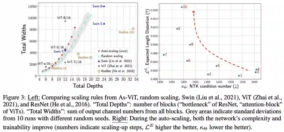 扩展轨迹如下图 3 所示。比较自主扩展和随机扩展,研究者发现扩展原则更喜欢舍弃深度来换取更多宽度,使用更浅但更宽的网络。这种扩展更类似于 Zhai et al. (2021) 开发的规则。相比之下,ResNet 和 Swin Transformer (Liu et al., 2021) 选择更窄更深。
