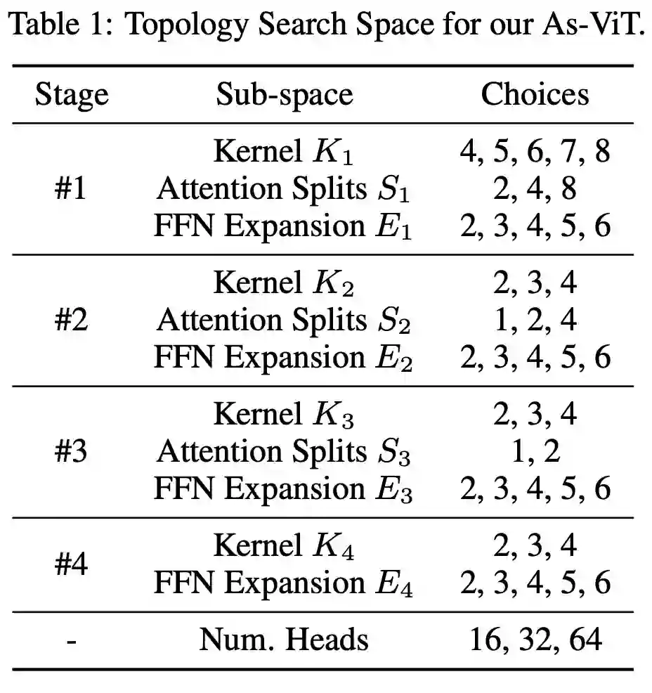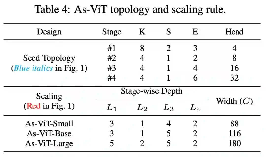 该研究在表 4 中展示了搜索到的 As-ViT 拓扑。这种架构在第一个投影(tokenization)step 和三个重新嵌入 step 中,促进了 token 之间的强烈重叠。FFN 扩展比首先变窄,然后在更深的层变宽。利用少量注意力拆分来更好地聚合全局信息。