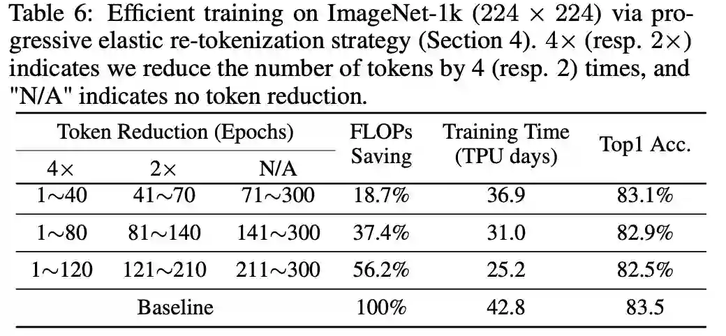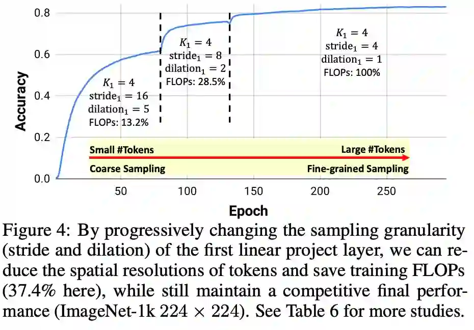 如图 4 所示,当 ViT 在早期训练阶段使用粗采样训练 ViT 时,它仍然可以获得很高的准确率,同时需要极低的计算成本。不同采样粒度之间的转换引入了性能的跳跃,最终网络恢复了具有竞争力的最终性能。