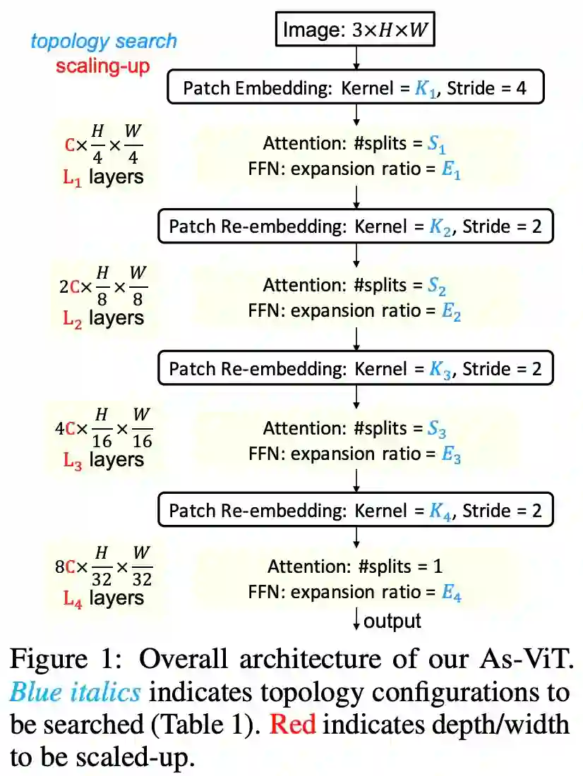 在设计和扩展之前,首先是为 As-ViT 扩展的拓扑搜索空间:首先将输入图像嵌入到 1/4 尺度分辨率的块中,并采用逐级空间缩减和通道加倍策略。这是为了方便密集预测任务,例如需要多尺度特征的检测。