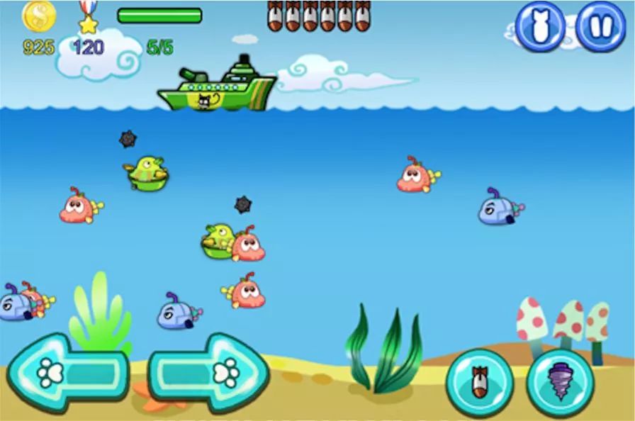 2012年我在腾讯游戏部门上班。因为嫌工资太少,就跟两个同事(也是我现在的合伙人)业余时间一起做手机游戏。彼时iPhone 5还没有发布,智能手机的大潮即将到来。花了大半年时间,我们做了个简单的“炸潜艇”游戏:玩家可以左手控制移动,右手控制3个发射不同武器的按钮。上线之前,我们互相打赌,猜上线后可以有多少收入。就是下面这个游戏,各位读者也可以猜一猜。
