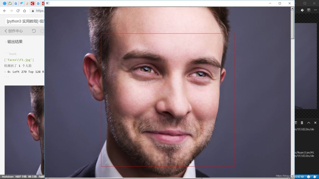 代码很简单,通过imread读取照片,然后进行检测,输出结果为dets的list,有几张人脸就会有几个item, 每个item都有.left(), .top(), .right(), .bottom()四个元素,代表人脸框的四个边界位置。最后通过win.add_overlay(dets)可以将标记的框显示在原图上。