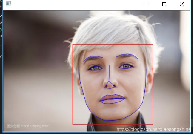 这段代码就是在test.py基础上加入了shape_predictor功能,使之可以在检测出人脸基础上,找到人脸的68个特征点。反映在图中就是蓝色的线。