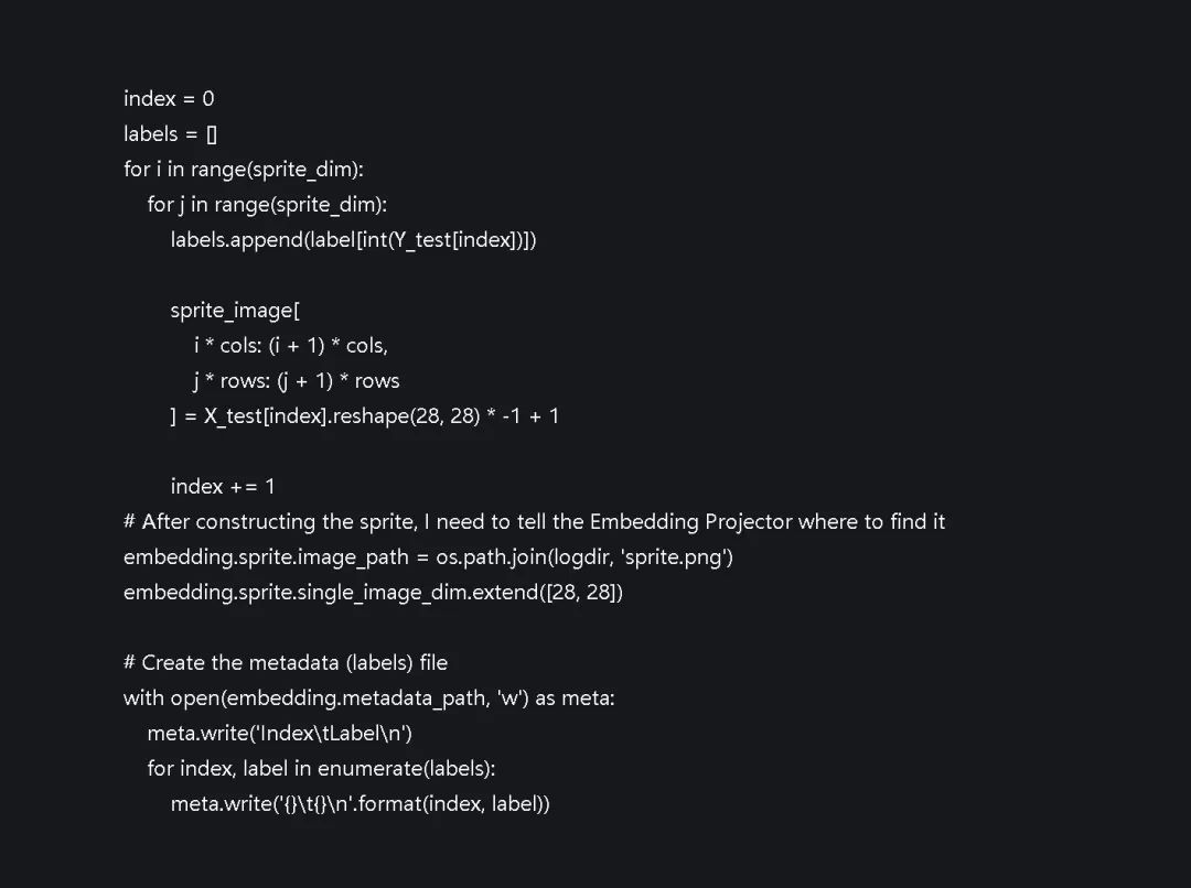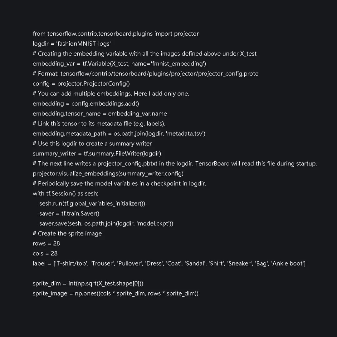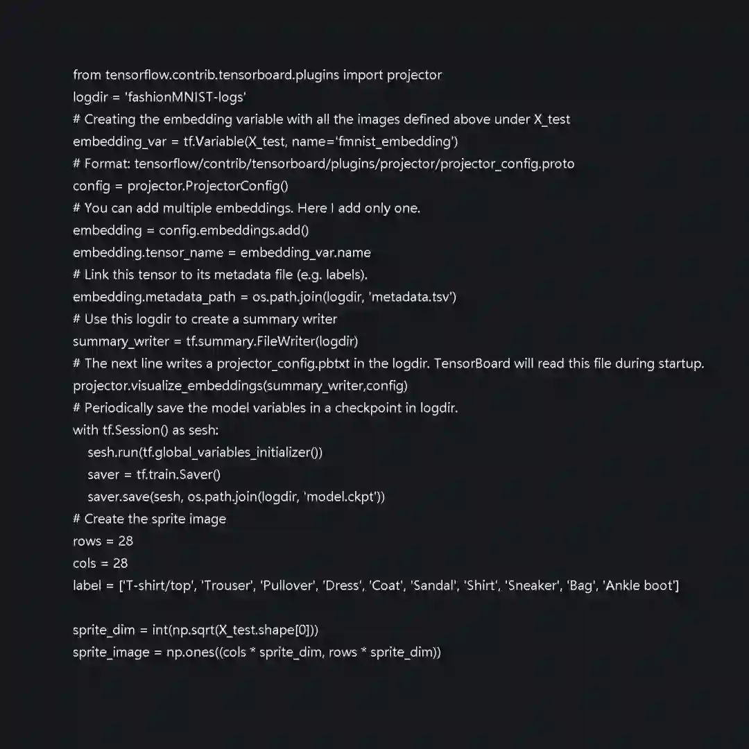 在这里,我将尝试使用TensorBoard表示高维时尚MNIST数据。在读取数据并创建测试标签后,我使用此代码构建TensorBoard的嵌入投影仪: