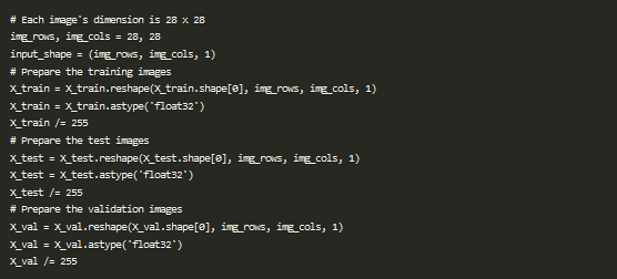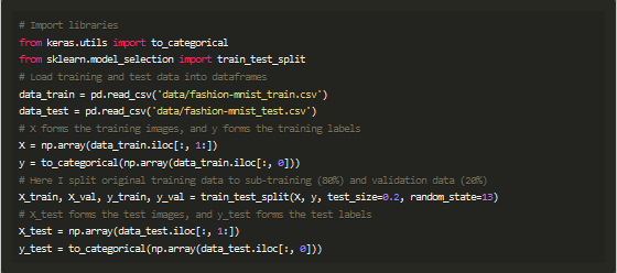 将原始训练数据(60,000张图像)分成80%训练集(48,000张图像)和20%验证集(12000张图像)优化分类器,同时保留测试数据(10,000张图像)以最终评估模型对数据的准确性从未见过。这有助于了解我是否过度拟合训练数据,以及如果验证准确度高于训练准确度。