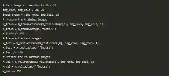 在加载和增强数据之后,我通过将它们重新重构为网络所需的形状并对其进行缩放以使所有值都在[0,1]间隔中来对它们进行预处理。例如,以前,训练数据存储在uint8类型的形状(60000,28,28)的数组中,其值在[0,255]间隔中。我将它转换为float32数组形状(60000,28 * 28),其值介于0和1之间。