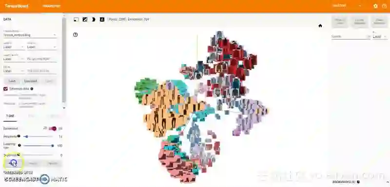 t-SNE:这是一种流行的非线性降维技术是t-SNE。嵌入可视化工具提供二维和三维t-SNE视图。在客户端执行局部动画算法的每个步骤,因为t-SNE通常保留一些局部结构,所以它对于探索局部邻域和寻找聚类是有用的。