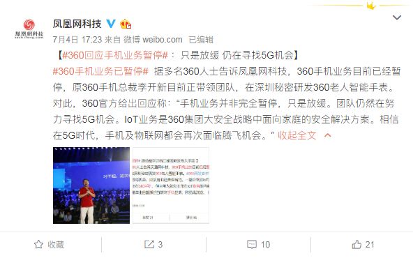 7 月 4 日,凤凰科技引用多名 360 人士的说法称,目前 360 手机业务已经暂停,而此前负责 360 手机的李开新在深圳秘密研发 360 老人智能手机手表。具体的说法是:“手机目前的状态是等待机会,团队骨血还是保留的,一部分支持 IoT 发展,一部分拓展的自己的硬件业务”。