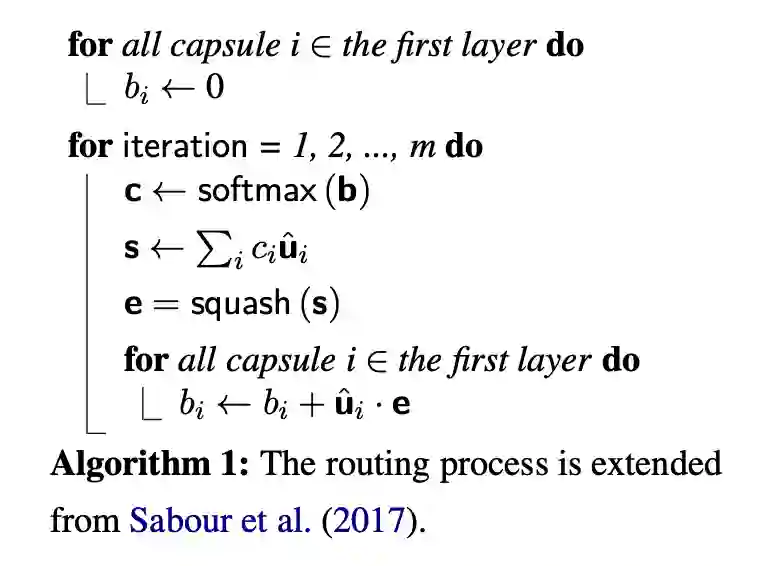 其中表示耦合系数,是由算法一的路由过程决定的。本文在胶囊层的前一层与后一层之间采用 softmax。算法一如图所示: