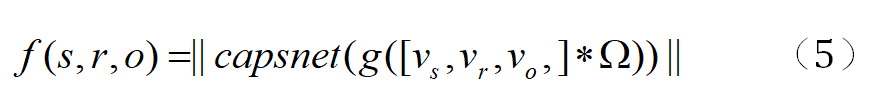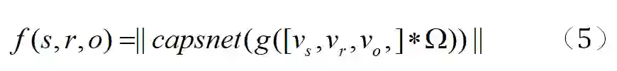 如图一所示,在本文提出的模型中,嵌入尺寸 k=4;过滤器数量 N=5;胶囊中第一层的胶囊中的神经元数与 N 相等;第二胶囊层胶囊中的神经元个数为 2:d=2。输出向量 e 的长度作为输入三元组 (s,r,o) 的得分。最终本文定义三元组的得分函数 f 如下: