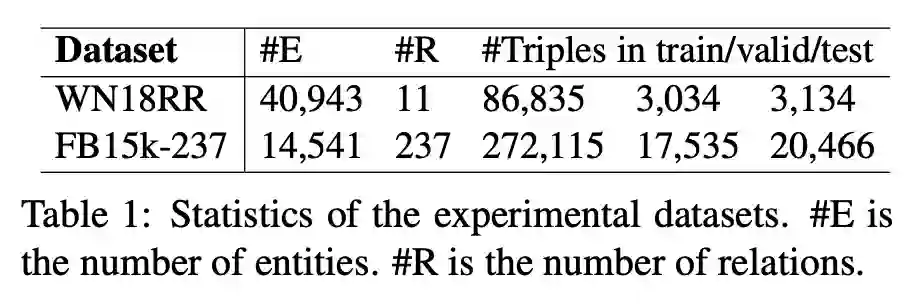 本文中的实验采用数据集 WN18RR 和 FB15k-237。这两个数据集因为剔除了包含可逆关系的三元组,故使这两个数据集更加真实,同时也增大了在这两个数据集上进行实验的难度。