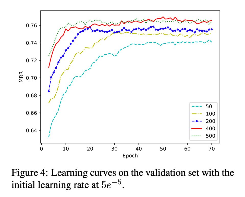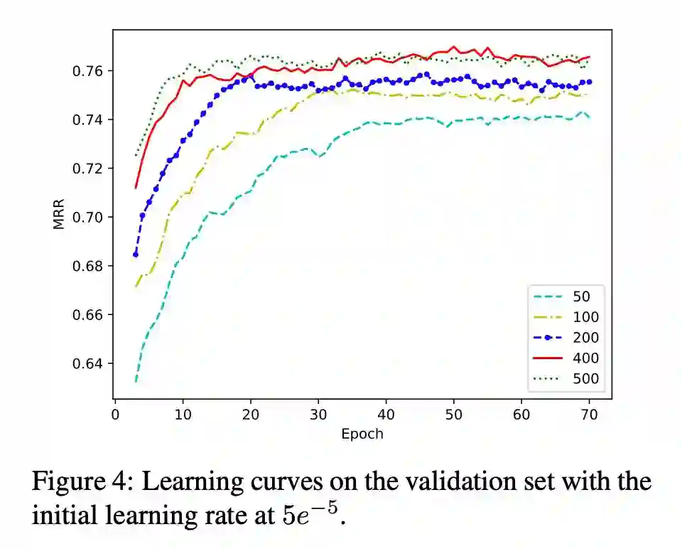 注:在本文实验中为了避免过拟合发生,在对用于模型 TransE、ConvKB 与 CaspE 进行训练的查询短语嵌入向量和文件嵌入向量在整个训练过程中保持不变。