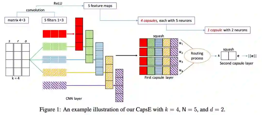 作者通过使用两个独立的胶囊层的简化架构来构建 CapsE 模型。在第一个胶囊层,作者构建了 k 个胶囊,使得所有特征映射向量同一维度上的数据构成一个胶囊。因此,每个胶囊可以捕获嵌入三元组中相应维数的条目之间的许多特征。这些特征被传递到第二层的一个胶囊中来产生一个输出向量,这个输出向量的长度(可以理解为 L1f 范数)就表示这个三元组的得分。
