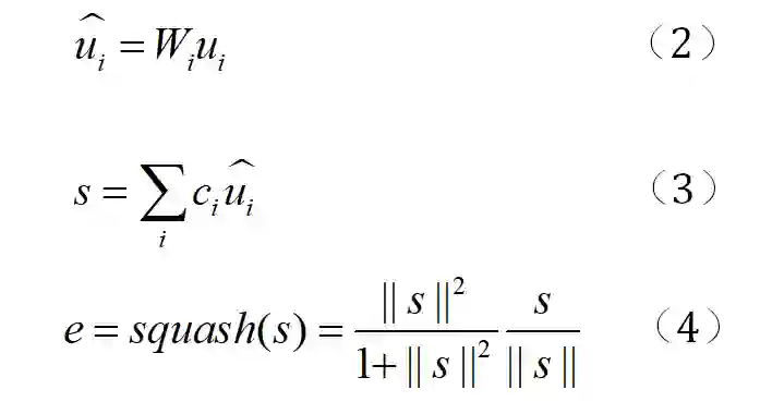 ,将其作为第二个胶囊层中胶囊的输入。在此之后胶囊采用一个非线性压缩函数产生一个输出向量