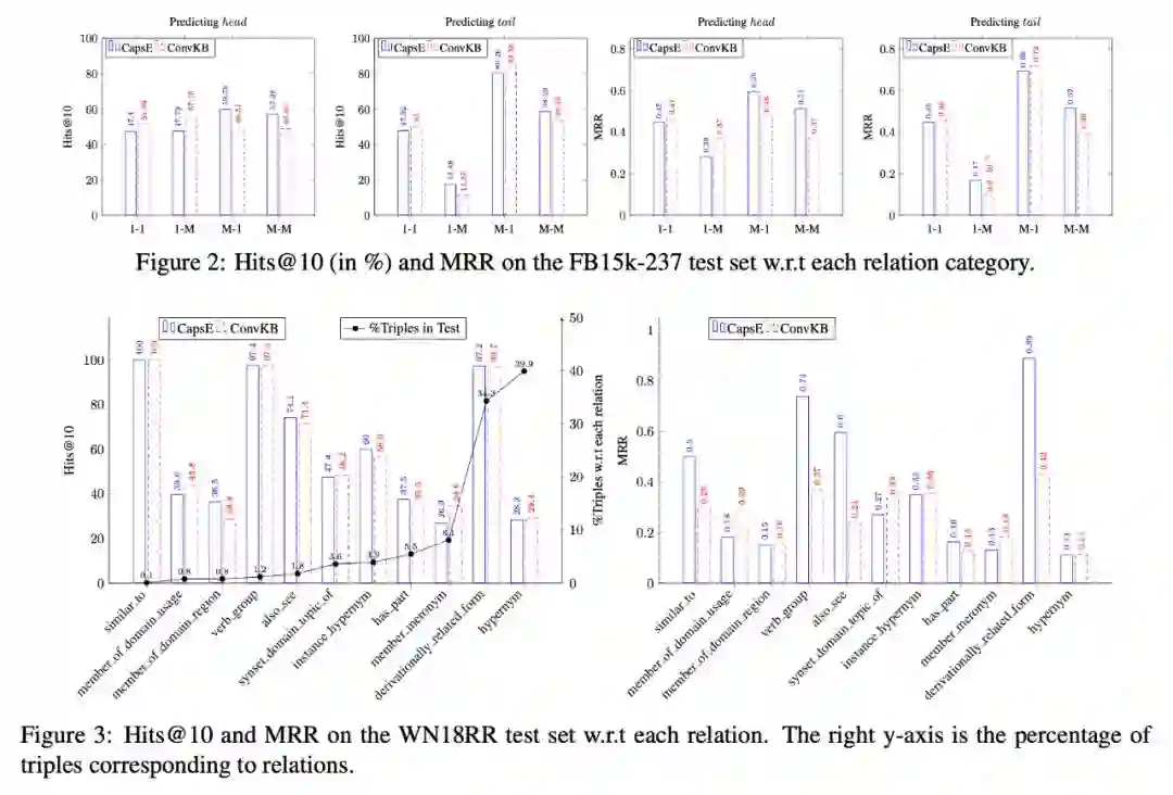 从上述结果图中可以得出如下实验结论:CapsE 在对 M 端实体进行预测时会得到比 ConvKB 更好的实验结果;ConvKB 在对 1 端实体进行预测时会得到比 CapsE 更好的实验结果。