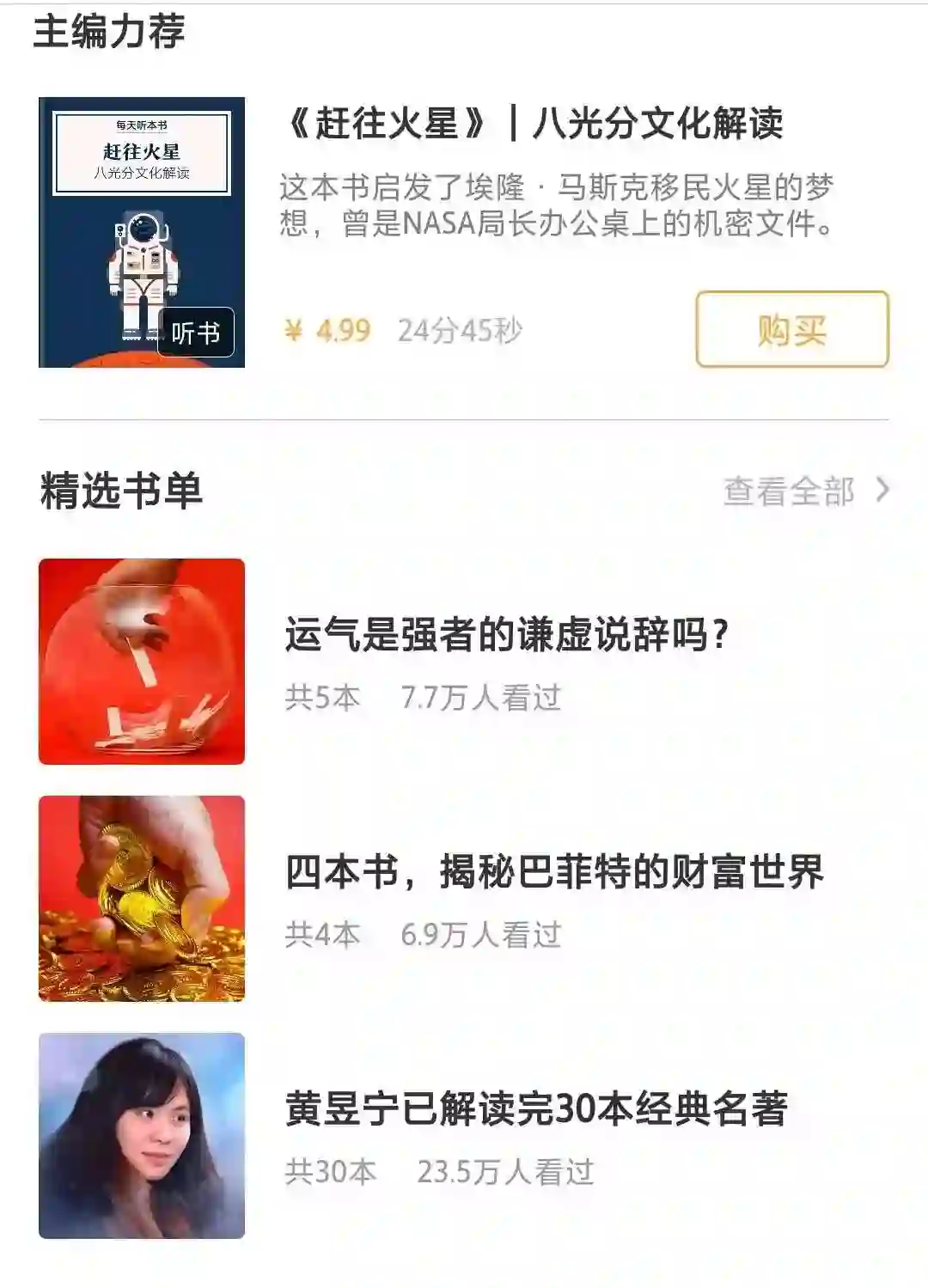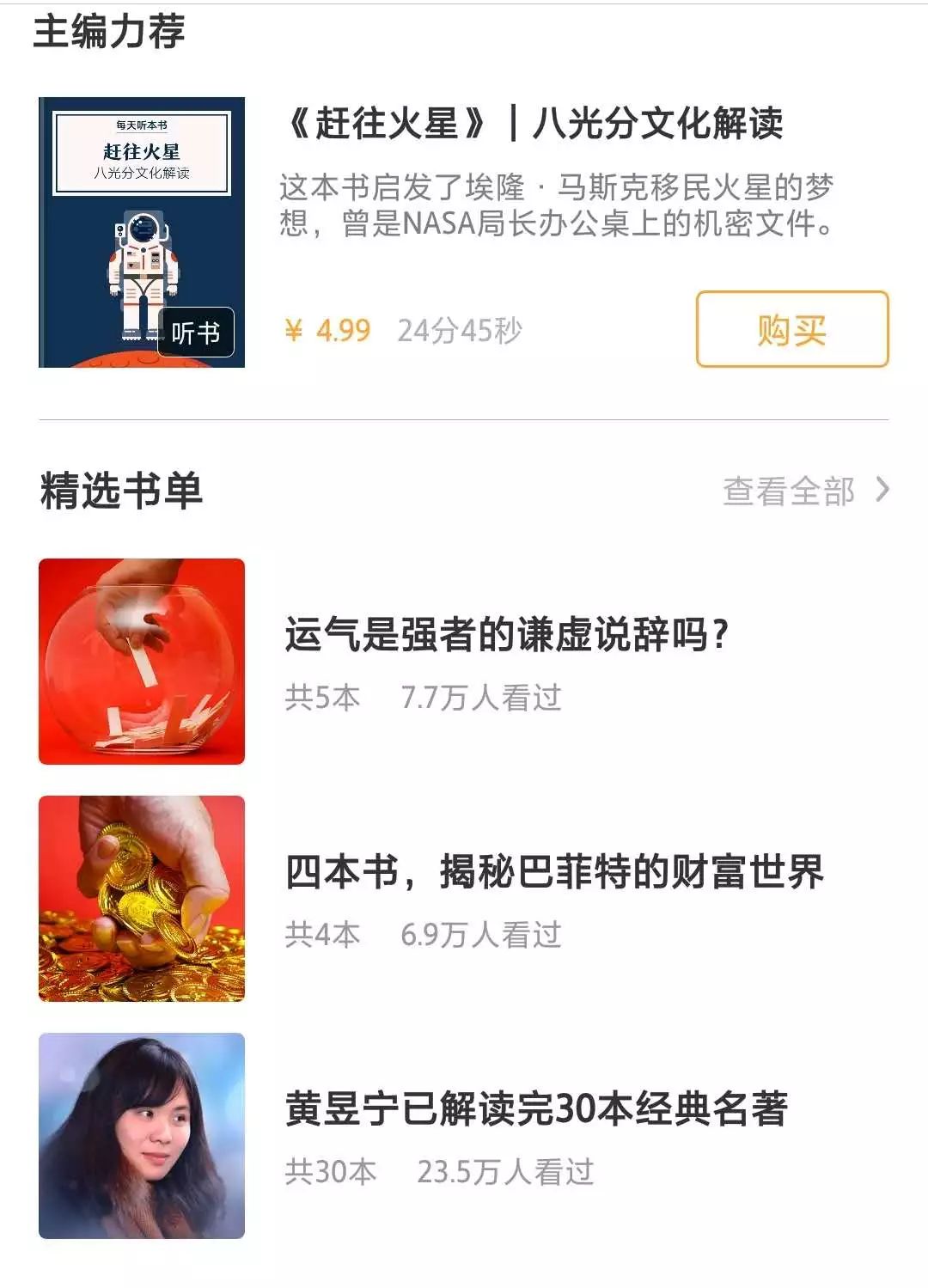 得到的“每天听本书”,在坐车、走路、候机时,用二三十分钟的零散时间听完一本书的解读,非常高效,奠定了我一年200~300本书的基础涉猎量,极大地拓展了我的知识边界。