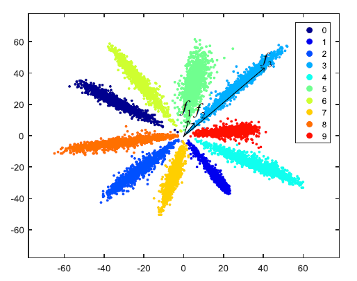 数学上,上面的三种变化会同时发生,导致最终的 feature 分布呈现出“扇形”形式。例如, [NormFace] 中给了这样一个例子,MNIST 上,feature 的维度限定为 2,10 个类别的 feature 分布可视化如下:
