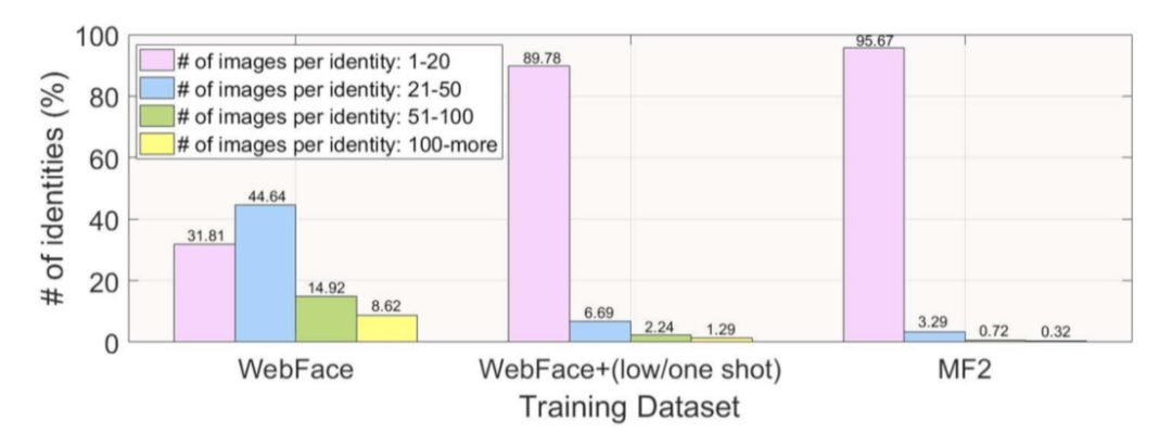 为了搞清楚为什么需要做 weight normalization,这首先要从数据不均衡的问题说起,这一问题在常见的人脸识别数据集中很普遍。下图展示了在几个常用的人脸识别数据集上类别与 sample 数量的统计分布。